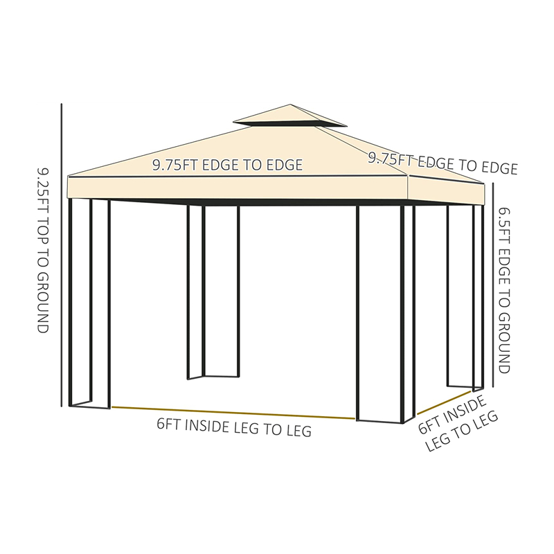 Sturdy iron frame, four triangular shelf, and eight ground staks make the assembled tent more stable Double tier roof, fine mesh sand, improve the flow of air, effectively prevent mosquitoes from entering the shed, not bothered by mosquitoes, 180 grams of polyester fabric, strengthen the shelter positive, make people more comfortable in the shed The spacious design, 10' width x 10' length x 9' height, provides enough space to make the gazebo tent more spacious and comfortable, and can accommodate more people or items such as larger sofas without crowding Equipped with 4 fast triangle panel to increase the overall stability, but also can be placed favorite flowers or green plants Dimensions: (118.11 x 118.11 x 105.51)" / (300 x 300 x 268)cm(L x W x H);Double roof design, strengthen the circulation of air, make in the shed more comfortable