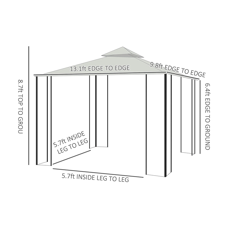 * WIDE CANOPY GAZEBO INFORMATION: Overall Dimensions: 9.75' L x 13' W x 8.75' H. Edge Height: 6.5' H. Space Between Columns: 5.73' L x 8.38' W. Includes 12 support stakes for mounting to soft ground.